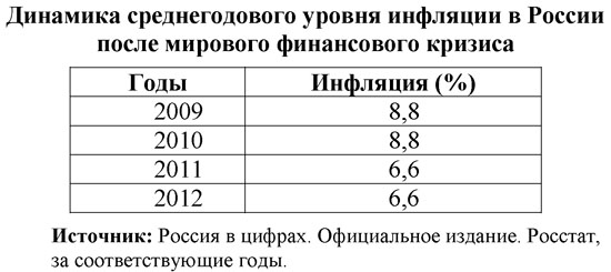 Накануне мирового финансового кризиса в 2008 г. в России продолжался рост цен. Уровень инфляции почти в два раза превысил прогнозные значения Правительства и в годовом исчислении составил 13,3%