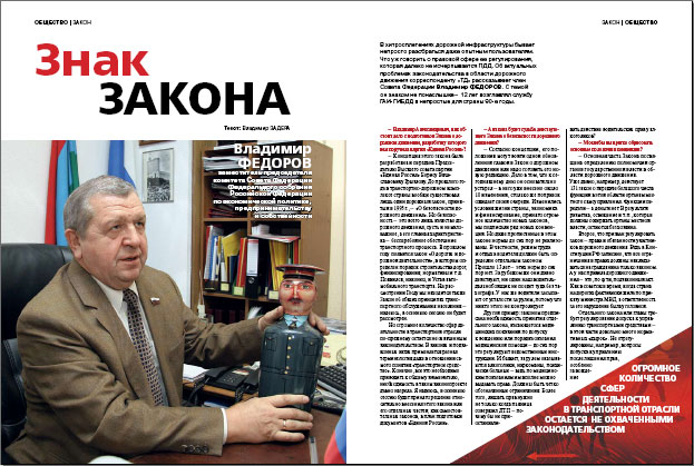 - Концепцияя этого закона была разработана и передана Председателю Высшего совета партии "Единая Россия" Борису Вячеславовичу Грызлову. До прошлого года в транспортно-дорожном комплексе страны вообще существовал лишь один дорожный закон, принятый в 1995 г., - "О безопасности дорожного движения". Но безопасность - это всего лишь качество дорожного движения, пусть и немаловажное, а его главная характеристика бесперебойное обеспечение транспортного процесса. В прошлом году появился закон "О дорогах и дорожной деятельности", в котором определен порядок строительства дорог, финансирования, нормативы и т. д. Появился, наконец, и Устав автомобильного транспорта. На рассмотрении Госдумы находится также Закон об общих принципах транспортного обслуживания населения надеюсь, в осеннюю сессию он будет рассмотрен.