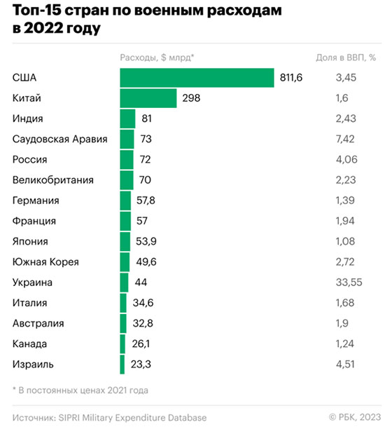 [5] Цит. по: Какие четыре страны обогнали Россию по военным расходам. РБК. 1 июля 2023 г. / https://www.rbc.ru/politics/01/07/2023/649b4fc89a79476643a275e9