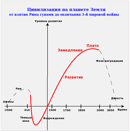 Исторически этот график может выглядеть таким следующим образом, как показано на рисунке. Можно спорить о деталях – этот график слишком абстрактен, но, тем не менее видно, что в развитии цивилизаций присутствует цикличность, подтверждаемая историческими наблюдениями, а, главное, фаза «деградация» и распад.