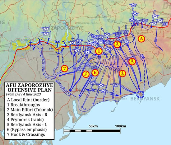 Тем не менее интерес к планам Запада и ВСУ на 2023 год сохраняется. Оперативный приказ (OPORD): «Общий план операций / Резюме командира». В сети появилась полная копия плана наступления, которую выложил один из блогеров:[28] «Прорвать передовую оборону русских на рубеже Нестерянка – Новоселовка (6 км и 19 км юго-восточнее Орехова соответственно) в глубину обороны гвардейских батальонов на участке Положск – Орехов, используя в первом эшелоне 47-ю и 65-ю дивизии. Отдельные механизированные бригады, 9-й армейский корпус (всего 2 танковых и 7 стрелковых батальонов – 8300 человек, до 60 танков, до 200 других ББМ, до 110 орудий и минометов, 12 РСЗО, до 100 моторных плотов). Прорыв линии соприкосновения будет в порядке 65-го, который уже на линии, затем 47-го. Соседние части, в том числе 128-я отдельная горно-штурмовая бригада, будут выполнять задачу по беспокойству соседних российских частей, чтобы не допустить подкрепления российских сил на главном направлении наступления».