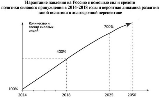 Другой стороной проблемы нарастающего неравенства мощи России и ЛЧЦ, и их коалиций в наше время выступает проблема поиска наиболее эффективного противодействия политике усиления «силового принуждения», которое относится к политике западной коалиции: всё второе десятилетие XXI века, но особенно после 2013 года, такое силовое давление постоянно усиливалось. Причем даже в те периоды, когда возникали, как казалось некоторым, перспективы для его прекращения или даже сотрудничества. Эта устойчивая тенденция сформировалась уже к началу 2018 года, а затем только усиливалась, приобретая самодовлеющее значение, когда любой повод использовался для усиления давления на Россию – от «отравления Скрипалей» до выборов в Белоруссии. На рисунке эту тенденцию можно отразить следующим образом при понимании того, что в период 2019–2020 годов она развивалась особенно быстрыми и непредсказуемыми темпами.
