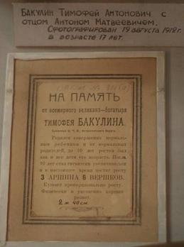 Дружил дед и со своим ровестником Всемирным великаном Тимофеем Бакулиным - ростом 2м 40 см, с которым он в 1918 году ездил за продуктами на Украину. Дед рассказывал такой случай. Однажды они остановились на какой то станции и начали торговаться, выменивая свои изделия на продукты, но железнодорожный состав неожиданно начал трогаться. Тимофей Бакулин подбежал к задней полутеплушке и снял её с рельсов, вагон запрыгал по шпалам, паровоз не смог потянуть состав и состав остановился. В теплушке ехали пьяные моряки-анархисты, которые увидев, кто являлся причиной их остановки вмиг протрезвели, и за то, что Баулин вновь поставил теплушку на рельсы немедленно "реквизировали" у украинцев мешки с зерном, сало и горилку, посадили Бакулина и деда к себе в теплушку и и на каждой станции показывали представление торговавшим крестьянам, одновременно набирая продукты и себе и им.