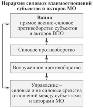 — «война»[5] — как прямое военно-силовое противоборство субъектов и некоторых акторов ВПО. Это определение отличается от общепризнанного, где война — военный конфликт между политическими образованиями — государствами, племенами, политическими группировками и так далее, — происходящий на почве различных претензий, в форме вооружённого противоборства, военных (боевых) действий. Именно такой подход к понятию «война» влияет на формирование современной ВПО в первую очередь.