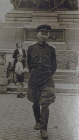 Колядинцев Г.Т., фото мая 1945 года, София, Болгария, у памятника царю освободителю Болгарии Александру II Фото сделано в первый день выписки из госпиталя после третьей контузии.