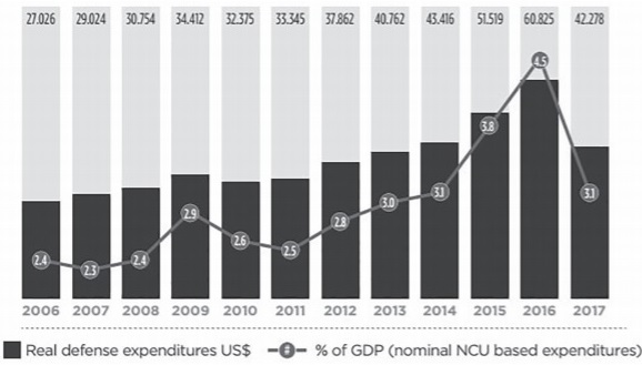 Как видно из приведенных данных, военные расходы государства в 2006 году составляли 2,4% ВВП, что соответствовало оценке внешних опасностей и угроз. В дальнейшем, в 2007–2009 годы, она выросла до 2,9% (параллельно с ростом ВВП и государственных расходов), а после кризиса 2008–2009 годов сократилась до 2,5%. Затем начался новый рост, который привел к тому, что в 2016 году военный бюджет достиг 4,5% ВВП, после чего он опять вернулся на уровень 2013 года. Это означает, что был достигнут некий предел увеличения военных расходов в мирное время.