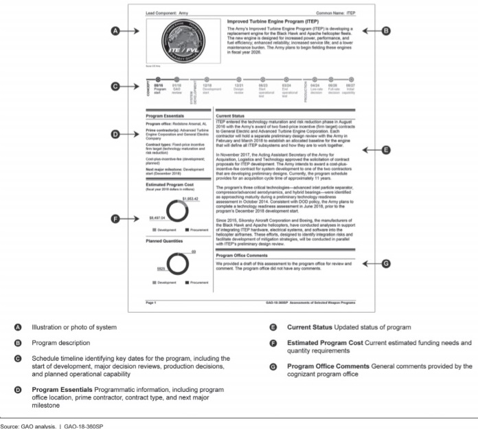 Но главное всё-таки это эффективность ВВСТ, которых выбрали для производства и оснащения ВС, но пользу которых на всех этапах необходимо тщательно контролировать. В США, например, ежегодно происходит переоценка на всех этапах эффективности процесса не только закупок, но и разработки и производства, которая становится предметом достаточно пристального публичного обсуждения. В частности, Счетная палата страны предлагает своеобразный алгоритм, представление, о развитии программы, который включает все основные её этапы — от изображения (А) и описания программы (В) до (G) научных комментариев руководителя офиса программы[6].