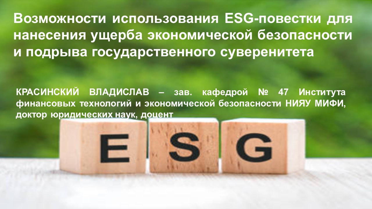 Источник опубликования: Красинский В.В.Возможности использования ESG-повестки для нанесения ущерба экономической безопасности и подрыва государственного суверенитета. Защита российских интересов // Современное право. 2023. № 7. С. 41-52. DOI10.25799/NI.2023.10.32.007