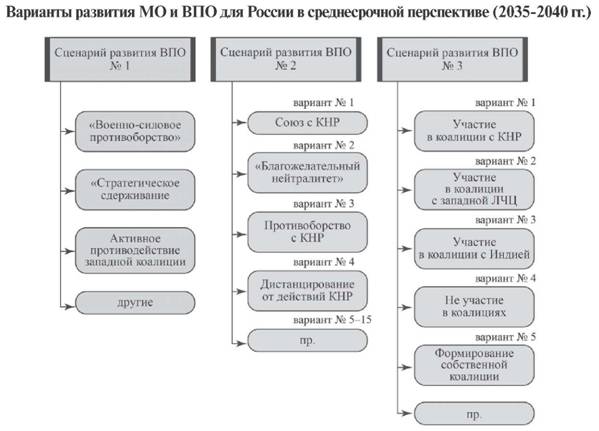 Как видно из схемы, сценариев и вариантов развития ВПО в долгосрочной перспективе 2035–2040 годов может быть значительное множество, из которых невозможно сегодня даже теоретически выбрать наиболее предпочтительный и наиболее вероятный. При этом надо помнить, что эти варианты – отнюдь не центральные. Они «боковые отростки» базового сценария развития МО.