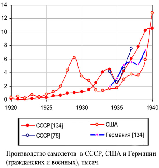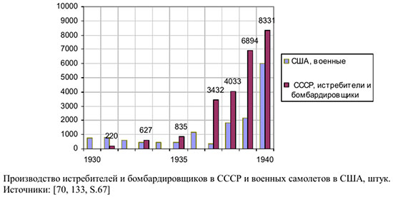 Ещё убедительнее выглядят сопоставления по военной авиации основных участников войны. Как видно из диаграммы, гонка между Германией США и СССР началась с 1935 года и до 1940 года стало ясно, что в ней СССР и США, как минимум, не проигрывают.