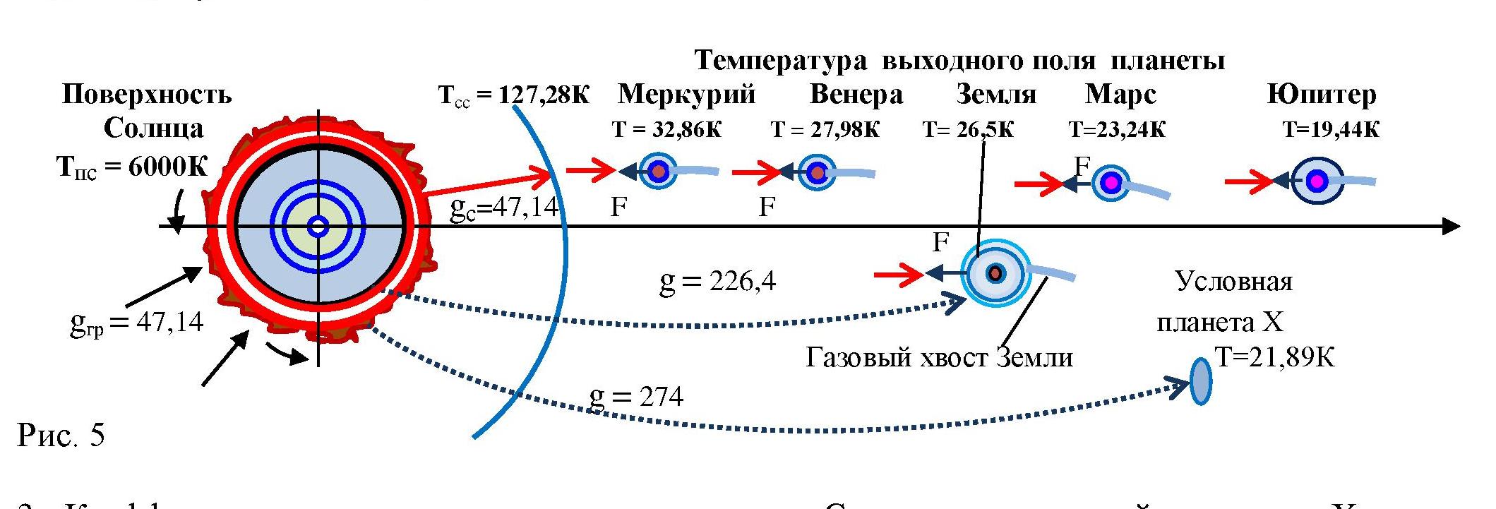 2. Для Юпитера, где температура выходного поля Твю = 19,44К , коэффициент температурного перепада g = Тпс / Твю = 6000К / 19,44К = 308,6 Следовательно, температура короны для доставки солнечных частиц к Юпитеру равна: Тксю = Тпс . g = 6000К . 308,6 = 1851600К. Температура выходного поля планеты Поверхность Тсс = 127,28К Меркурий Венера Земля Марс Юпитер Солнца Т = 32,86К Т = 27,98К Т= 26,5К Т=23,24К Т=19,44К Тпс = 6000К F gс=47,14 F F F g = 226,4 Условная gгр = 47,14 планета Х Газовый хвост Земли Т=21,89К g = 274. Рис. 5