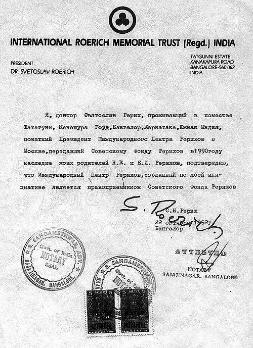 Этим документом Святослав Рерих подтвердил права МЦР на наследие Рерихов, переданное им Советскому фонду Рерихов в 1991 году.