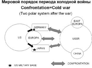 но и все эти факторы и тенденции во взаимосвязи и в динамике, в той степени влияния, которая оказывается ими друг на друга. Именно эта часть анализа и является наиболее сложной потому, что архитектура и структура МО достаточно быстро меняется. Для иллюстрации приведем самый простой пример развития архитектуры МО за последние 60 лет, как его видит известный японский политолог К. Исигоока[2]. Он, в частности, рассматривает три ситуации, которые характеризуют состояние МО в XXI веке. Это означает, что для современного анализа необходимо учитывать «остаточное» влияние (экономическое, историческое, правовое и пр.) прежних состояний МО.