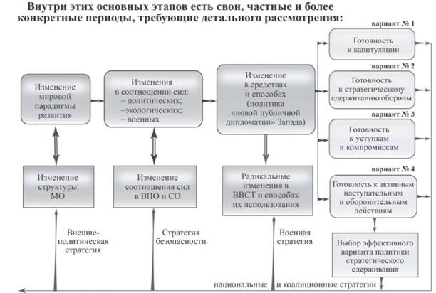 3-й этап – изменения в политике, средствах и способах субъектов и основных акторов ВПО: прежде всего ЛЧЦ, их военно-политических коалиций, основных («стержневых») государств. Речь идет о военной политике, стратегиях и средствах их достижения в современной ВПО, то, что и является собственно военной политикой и военной стратегией государств и коалиций.