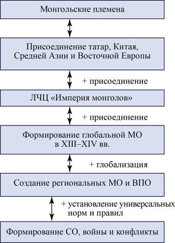 В частности, очень наглядно эта тенденция проявилась в развитии МО (с последующим формированием ВПО) на примере эволюции развития монголо-татарской ЛЧЦ[21]. Создание огромной империи и находящейся во многом под её влиянием уникальной глобальной МО (охватывающей Китай, большую часть России, Центральную и южную Азию, значительную часть Европы и часть Африки) привело к формированию не менее уникальной глобальной ВПО, которая конкретизировалась в региональных ВПО и СО, войнах и военных конфликтах.