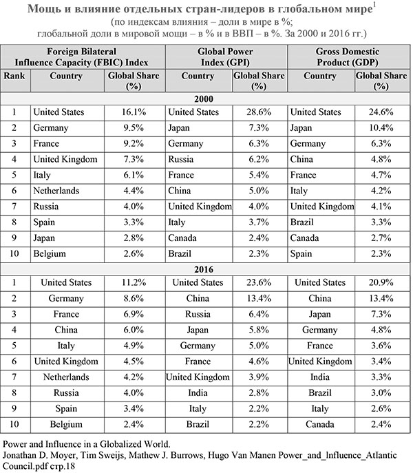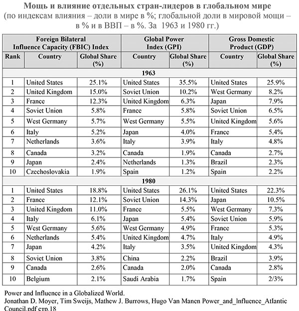Аналогичные многочисленные попытки количественного анализа предпринимаются и за рубежом. Так, авторы известной работы «Мощь и влияние в глобальном мире», например, проводят сопоставление ведущих стран за несколько периодов по нескольким критериям: индексу «Зарубежного двустороннего влияния», индексу «глобальной мощи» и «индексу ВВП», которые существенно отличаются друг от друга. Ниже, в таблице даны данные сопоставлений за 1963, 1980, 2000 и 2016 годы.