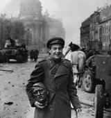 Евгений Долматовский в Берлине, 2 мая 1945 г. С 1939 по 1945 г. Долматовский в качестве военного корреспондента находился в действующих частях Советской армии. В 1941 г. попал в окружение и был взят в плен, из которого бежал снова на фронт (эти события отражены в повести "Зеленая брама").