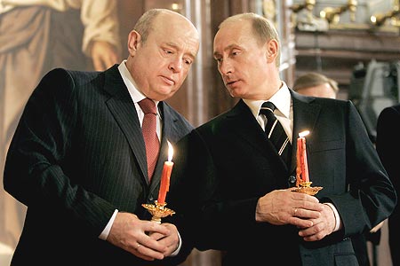 Председатель правительства РФ Михаил Фрадков и президент России Владимир Путин во время пасхального богослуже (фото: ИТАР-ТАСС)