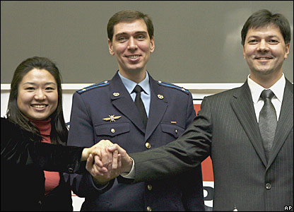 Южнокорейская астронавтка Ли Со Ён и российские космонавты Сергей Волков и Олег Кононенко в Звездном городке