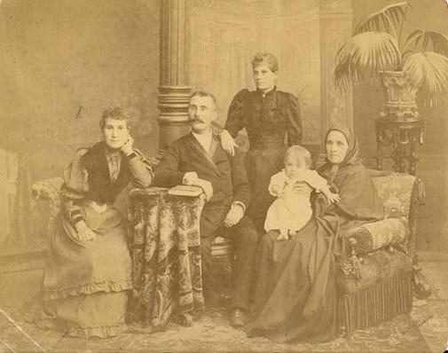 На фото: Семья Шевыревых, в центре сидят калужский торговец А. А. Шевырёв (старший) со своей супругой Синклитьей Сергеевной Шевырёвой (урожд. Барановой), 1910 годы.